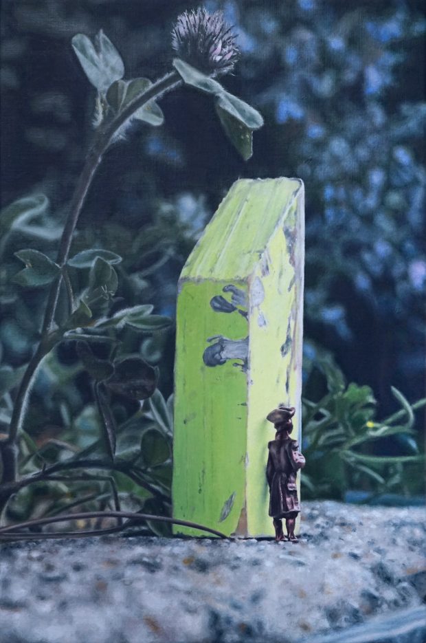 手のひらに乗るような小さいモチーフを風景に見立て、大画面に引き延ばす油彩作品《Grandscape》シリーズを軸に制作している。現実には存在し得ないような色味や質感になっている一方で、山のようだったり湖のようだったり、ある特定の風景を模している部分もある。郷愁を感じさせる静謐な空間を、油彩の筆触だけに宿るリアリティや存在感と共に描き出す。