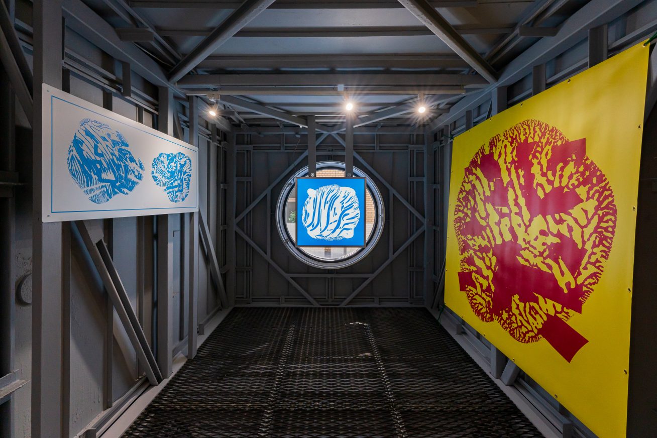 当時常設されていた中銀カプセルタワービルのカプセルも使い、3名の作家の展示を3つの空間にわけて没入できる導線としました。