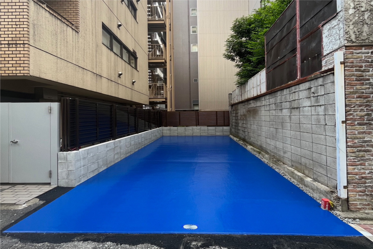 特徴:鮮やかなブルー床とコンクリート背景が映える実験的空間